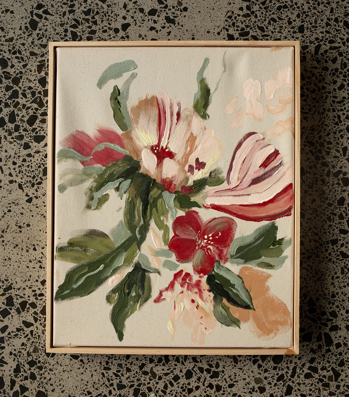 Tender Emergence celebrates the quiet, powerful act of beginning anew. The composition blooms with movement and softness — petals unfurling in hues of blush, crimson, and green — evoking both vulnerability and resilience. Each brushstroke feels like a breath of release, a moment of opening toward light after stillness. This piece honors the fragile grace of healing, the beauty found in imperfection, and the courage it takes to let life unfold once more.